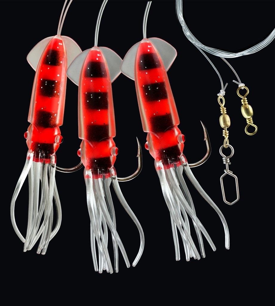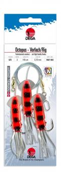 DEGA Octopus-Meeresvorfach. Ein stark UV-aktives Octopusrig mit 3 großen "Anbißstellen" mit hochwertigen, stabilen Einzelhaken der Größe 6/0 an 0,70 mm starker monofiler Schnur, Länge 140 cm. Ein gefundenes Fressen für die Räuber unserer Meere. Ob Dorsch, Köhler, Seehecht, Pollack oder Leng, sie werden diesem Leckerbissen nicht widerstehen können.