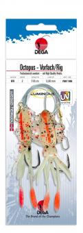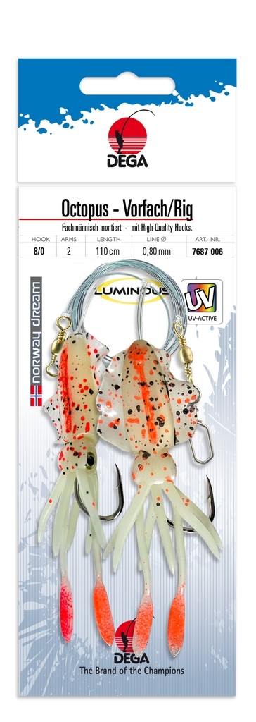 DEGA Meeres-Rig Dieses 110 cm lange Rig verfügt über zwei 3D-naturgetreue Octopus-Beifänger die mit hochwertigen, sehr stabilen Haken der Größe 8/0 ausgestattet sind. Da die Octopusse UV-aktiv sind, erhöhen sie ihren Reiz erheblich. Gerne lassen sich Dorsch, Leng, Köhler, Seehecht, Pollack und sonstige Consorten zum Anbiß verleiten! Lieferbar in den Farbvarianten "luminous" - "pink" und "motoroil"